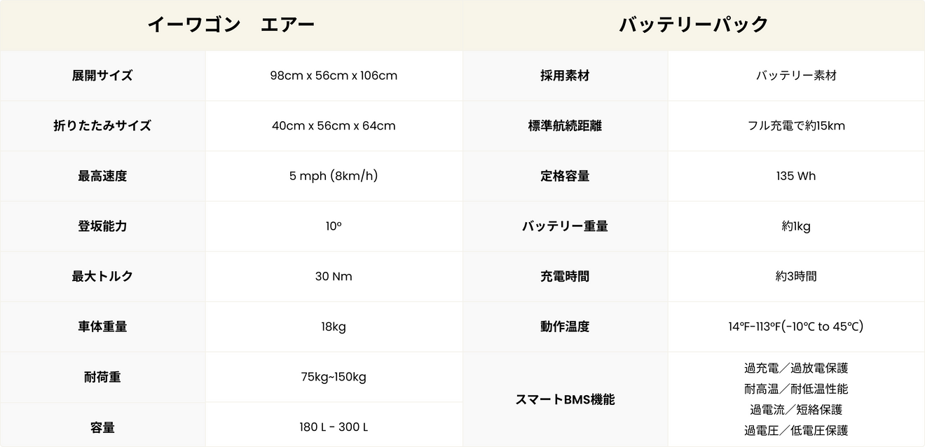 皆さまのご支援より、e-Wagon Ultraは高い評価をいただいてきました。その経験をもとに、私たちはe-Wagon Air を開発しました。e-Wagon Air は家族での利用を想定して設計され、従来のモデルより軽量で持ち運びやすく、さらにスマートな機能を搭載しています。